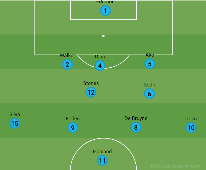 It’s no coincidence that this run of form has coincided with the return of key players such as De Bruyne and Rodri. It has gave them the ability to play different systems and rotate the squad which can never be underestimated. Just in their recent five outings we have saw Guardiola’s men play a 4-1-4-1 against Chelsea, 4-2-3-1 against Luton and a 3-2-4-1 against Manchester United (as shown bellow exclude the numbers).