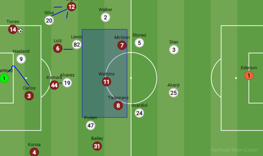 Manchester City pressed aggressively from the off. As Martinez plays to Pau Torres, the Cityzen’s forward line goes for a mix of man-to-man and zonal. Erling Haaland blocks Torres’s ability to return the ball to Martinez or Carlos. Bernando Silva blocks a path to Digne, meanwhile, Alvarez and Lewis go man-to-man on Luiz and Kamara.